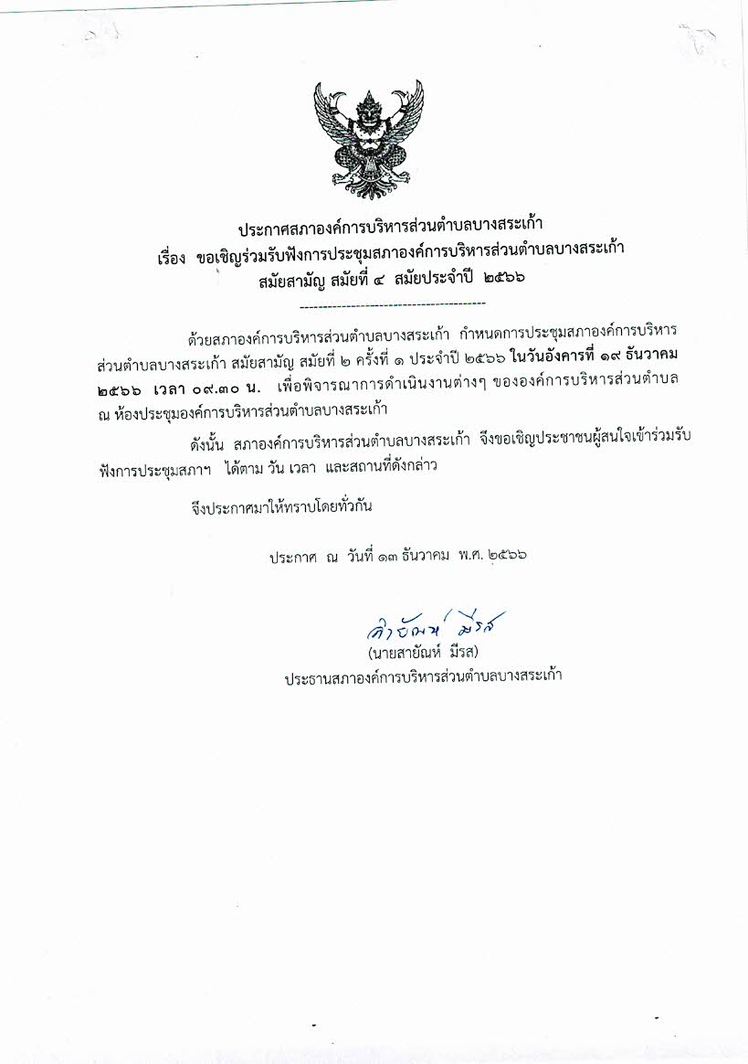ขอเชิญร่วมรับฟังการประชุมสภาองค์การบริหารส่วนตำบลบางสระเก้า สมัยสามัญ สมัยที่ 4 ปี 2566